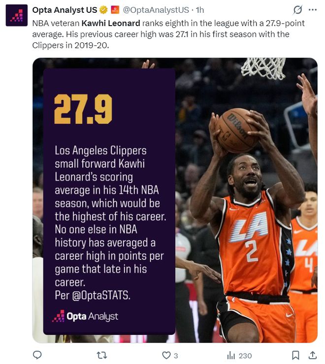 美记DanteEvans写道:伦纳德在职业生涯第14个赛季拿到场均27.9分创造生涯新高,这是NBA历史上首位在生涯第14个赛季拿到场均最高分的纪录,前无古人。